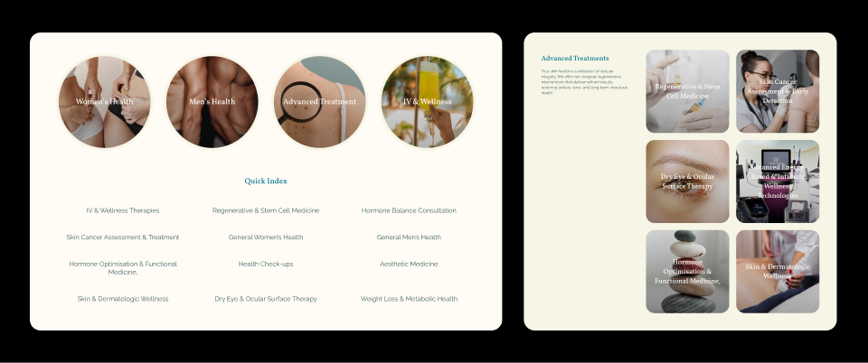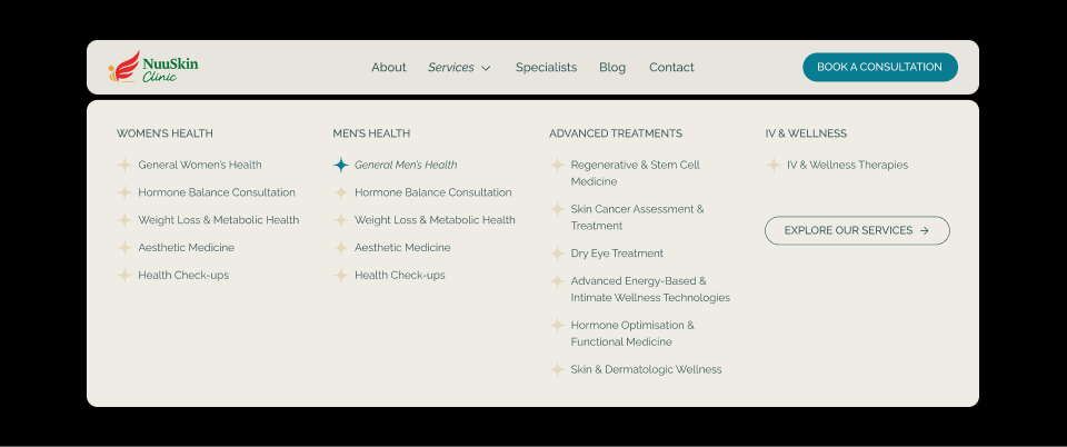 We engineered a strategic information hierarchy that organizes the clinic's diverse offerings into four intuitive pillars: Women's Health, Men's Health, Advanced Treatments, and IV Therapy. To make the browsing experience effortless, we implemented a segmented navigation strategy within the main service dropdowns and the central service hub. This allows visitors to identify the right path for their needs immediately, ensuring a seamless transition from discovery to consultation.