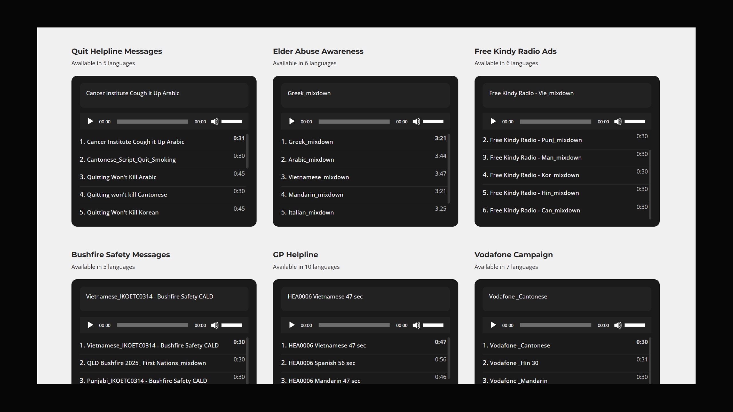 Beyond video content, WMI needed a streamlined way to showcase their radio campaigns across diverse communities. Standard audio players couldn't handle the complexity of their multi-language library effectively.